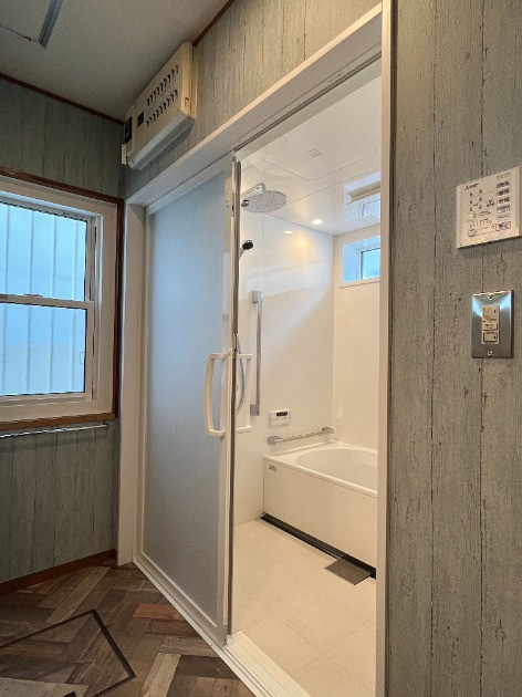 ・ドアを開き戸→引き戸へ変更。バスチェアが扉にあたる心配もなく、万が一、中で人が倒れても開閉がしやすい。(引き込みスペースの確保が必要)