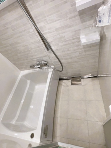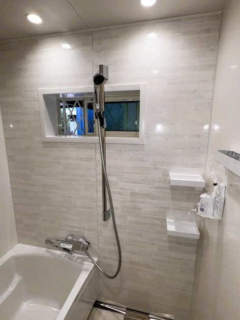 ベージュ系で統一されて落ち着いた浴室になりました。