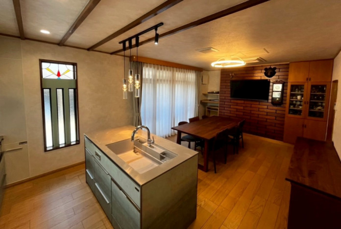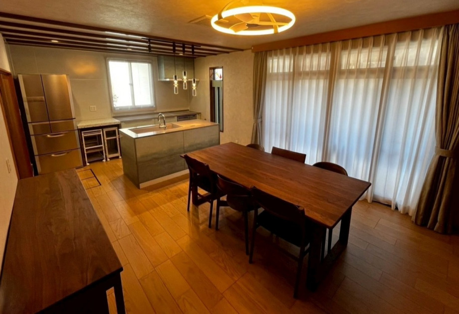 明るく広いキッチンがご希望でした。収納たっぷりの立派なキッチンでしたが、お部屋のスペース的にも見た目的にも、圧迫感のある印象でした。ご家族が集まると大人数になり、まだ小さなお孫さんも遊びに来られる為、スムーズな動線と目が行き届くアイランド型でご提案。ワンちゃんも一緒に暮らす為、傷にも強いホーロー製かつ、収納たっぷりなレミューを採用。キッチンスペースを無理なく狭め、ダイニングスペースを拡張。広々と使えるプランとしました。また、東側に明り取りを新設。朝日が差し込む気持ちの良い空間になりました。