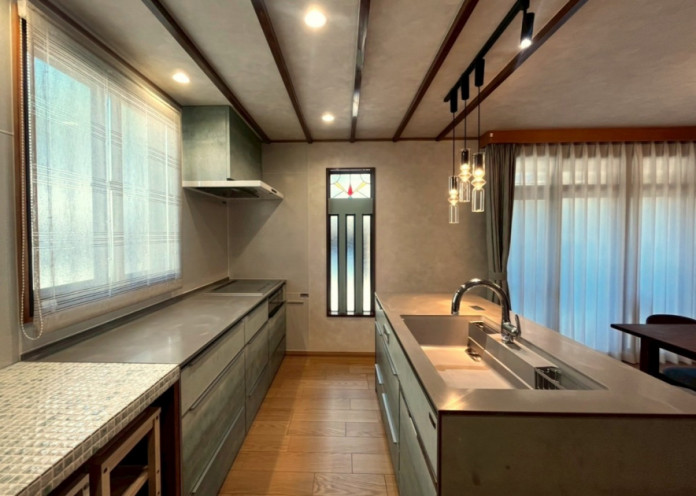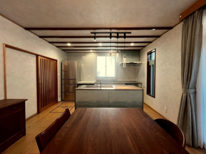 コの字型の対面キッチンから回遊性のあるアイランド型へ。ご家族が集まる時も広々使えます。化粧梁の効果で、空間のメリハリが生まれ、落ち着いた大人の雰囲気に。
