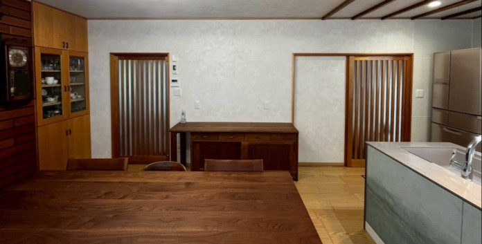 大切な食器棚は下台を残し、テーブルと同じウォールナットの天板を取り付けました。ご家族のお好きなお酒のコーナーになっています。引き戸も、縦格子のすっきりとしたデザインに一新しました。