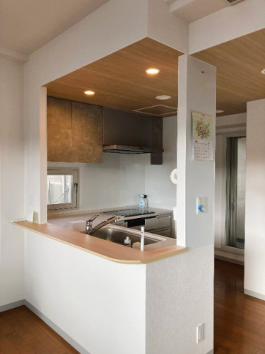 カウンターをホワイトから木目調に変更し、天井にも木目調クロスを採用。