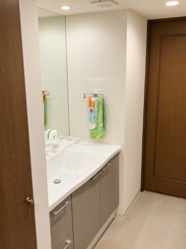 一面鏡はそのまま活かし、クロスの貼り替えを行い、スッキリとしたデザインの洗面化粧台に交換してスタイリッシュな雰囲気に仕上がりました。