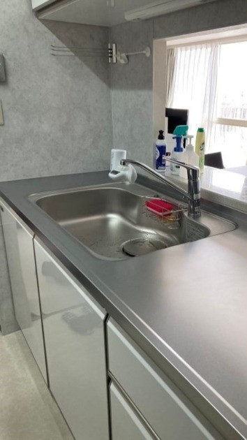 キッチンパネルには今インテリアでトレンドになっているコンクリート調の柄を採用しており、周囲のインテリアにも馴染む上品なキッチン空間に仕上がりました。