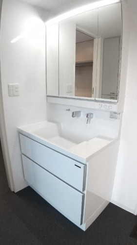 収納スペースの限られてた壁埋込型メディシンボックスを撤去し、三面鏡裏が収納スペースになっているものにリフォームし、収納量アップ。