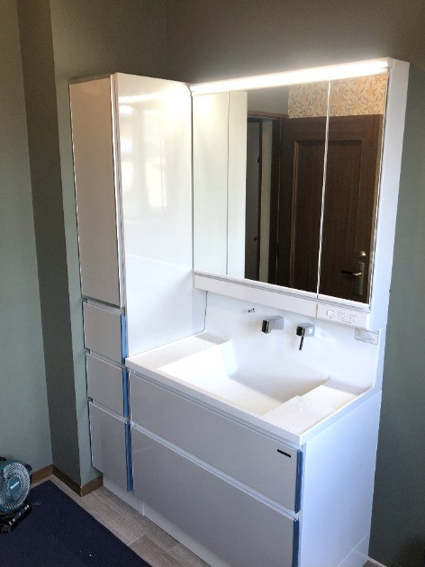 三面鏡裏収納とスライドキャビネットに加え、洗面化粧台の左横にトールキャビネットも設置し、たっぷり収納が可能に。