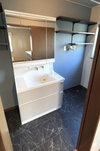 使い勝手の悪かった吊戸棚は撤去し、洗面化粧台の両側にオーダー製作した棚板収納を設置し収納スペースをしっかり確保。