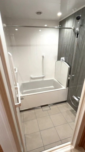 石目柄のパネルで高級感を演出しつつ、将来を見据えて手すりを3ヵ所設置し、安全面にも配慮した浴室空間に仕上がりました。