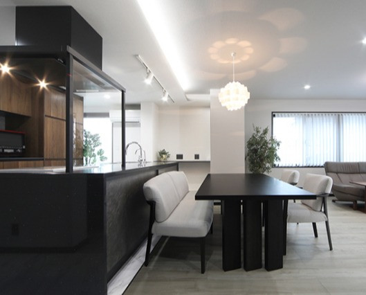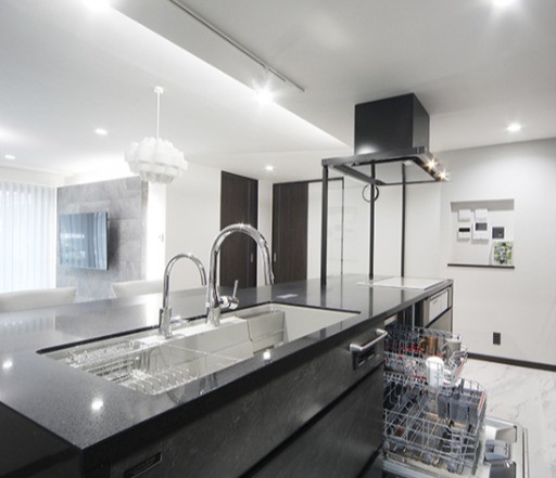 キッチンは1箇所で共用されるため、数人でキッチンに立っても手狭に感じないよう、十分な広さをとりました。リビングダイニングが見渡せるアイランドキッチンは会話も弾みます。大容量のキャビネットは調理器具や家族の食器をすっきり収納。食洗機は洗浄力が高く大容量が魅力の「BOSCH」を採用しました。下ごしらえから片付けまでノンストレスの機能的なキッチンです。