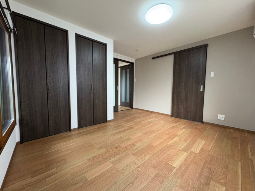 床の沈みが気になっていた、寝室もリフォームして安心して眠れる空間に。右奥の引き戸の先には、トイレ・洗面化粧台に続く設計となっています。