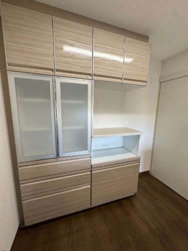 掃除しやすい人口大理石カウンターとシンク下の食洗器で家事らく提案。マンションの限られた空間で、めいっぱいのカップボードを納めました。