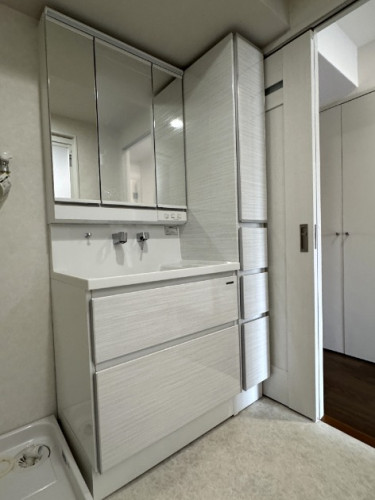 入口を片開き→引き戸にして廊下空間もアップ。梁など成約がある中での最大限の収納がとれる洗面台プランを提案しました。