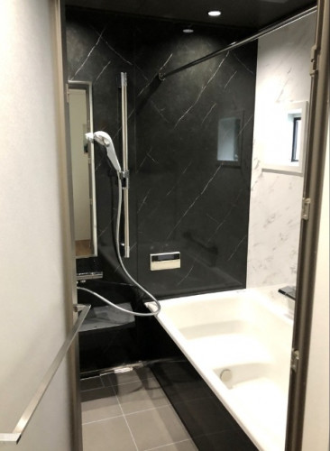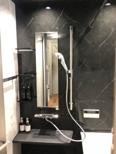 上質な光沢と重厚感のあるデザインは、毎日のバスタイムを特別な時間に変えてくれます。アクセントパネルとフラット天井をブラック系でコーディネートされ、ラグジュアリーホテルのような雰囲気を醸し出しています。