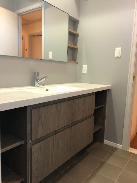 リフォーム前のサニタリースペースには、約80cm幅のカウンター洗面台と物入がありました。