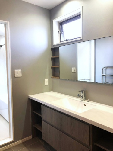 継ぎ目が目立たず美しい仕上がりも特徴です。ミラーボックスの両隅には、アイキャッチになるニッチ収納を造作しました。