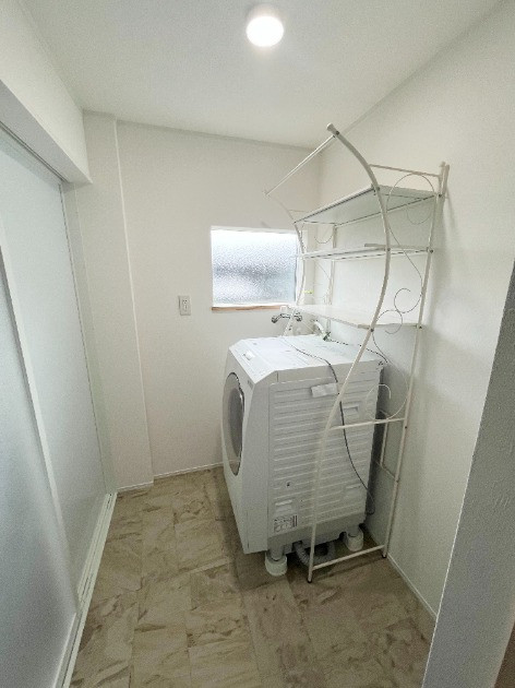 使っていない勝手口を明り取りのFIX窓に交換して、給水給湯や排水の位置も変える事にはなりましたが、洗濯機置き場をしっかり決める事で、洗濯カゴや収納棚を置いても使い勝手の良い洗濯脱衣室になりました。