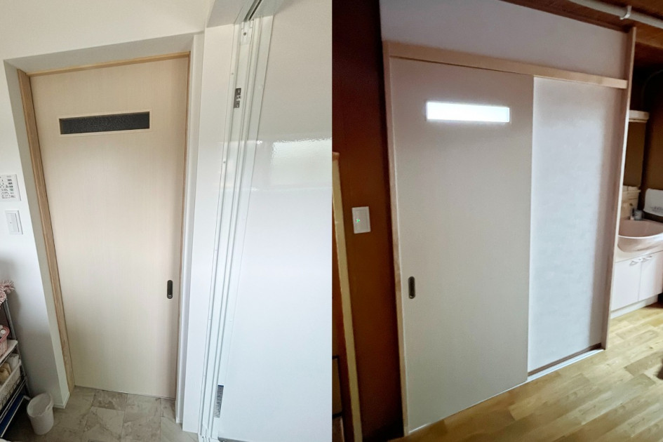 引違い戸を片引き戸に変更する事で、袖壁にリモコンや・スイッチを設置する事ができ使い勝手が良くなりました。またガラス戸を上部に明り窓付のフラッシュ戸に変更する事で、ガラスが割れてケガをする様な事故のリスクも少なくなりました。