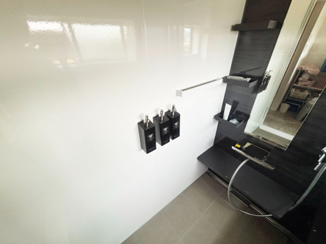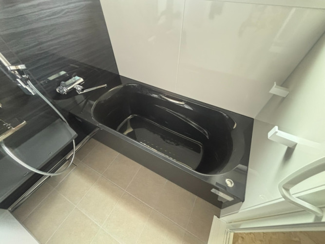 天井→壁→カウンター・浴槽をブラックで統一、残りの3面は入口ドアを含めた標準仕様のホワイトにした、モノトーンコーデは値段の追加を出す事無く、落ち着いた雰囲気でありながら暗くなり過ぎない空間コーディネートとしています。