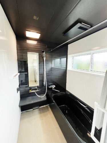 モノトーンコーデのシステムバス、清掃性を考慮してアクリル人造大理石浴槽+磁器質タイル床の仕様に、給湯器に自動湯はりが無い代わりにストップ水栓を採用する事で「家事らく」仕様にしています。バリアフリーはもちろん、断熱性も向上した浴室内は浴室暖房乾燥機を付ける事でヒートショックのリスクも減り、断熱浴槽で風呂の湯も冷めにくい省エネ仕様となっています。