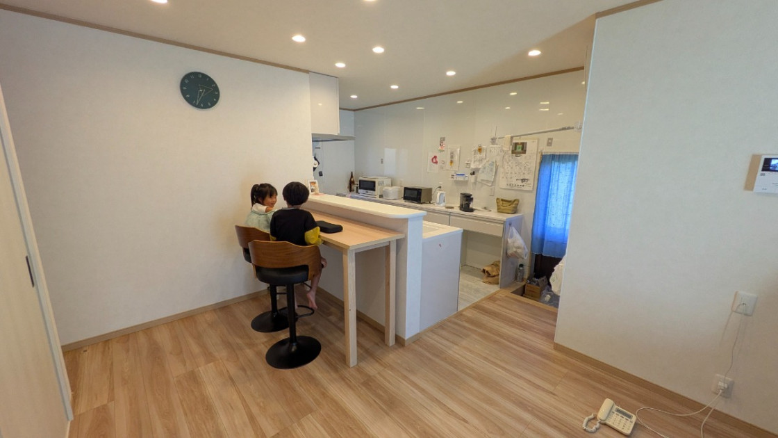ノイズの多い部屋に収納力を持たせました。三連の引き違い扉の収納を設け、ローカップボードを900×4台を設け、背面のホーローパネルでマグネットの活用を実践しています。キッチンを対面化に息子が作ったカウンターを配置してLDKが広がり満足です。照明はすべてDLとしてノイズのない空間になりました。間取り変更に伴い外部サッシの交換、断熱材も入れ替えることで高気密高断熱が実現し、この猛暑の夏もエアコンの効きが抜群で断熱効果を実感しています。
