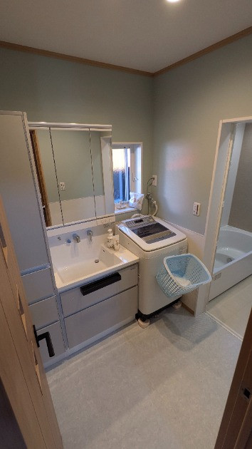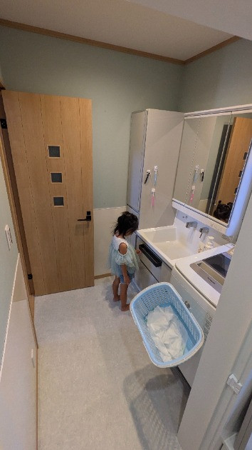 出窓と洗面台が合体したものを使用して、収納力・断熱効果も乏しいものでした。750㎜の洗面台に300㎜のトール収納を組み合わせ収納力を上げました。洗面脱衣室と浴室を広くとるため、トイレを旧和室の押し入れの位置に移動するなど間仕切りを変えました。面積のやりくりがかなり厳しかったですが、何とか収めてもらいました。おかげでトール収納にタオルや下着を入れることで脱衣室にラックなどを置かなく、広々と利用でき満足しています。