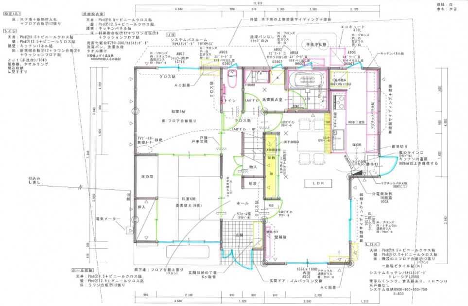 リフォームのご要望はキッチンの対面化、浴室は1616サイズで足が延ばせる広さ、洗面脱衣は1坪サイズで収納力アップが要望でした。浴室とLDKの間仕切りは高基礎となるため、解体工事がかさむため間仕切りは変えれませんでした。よって8帖の和室の押入にトイレを設けることで面積のやりくりをしました。玄関の正面にトイレの配置を可とのことでしたのでこのような配置計画としました。また熱源はLPGからオール電化に繰り替えています。
