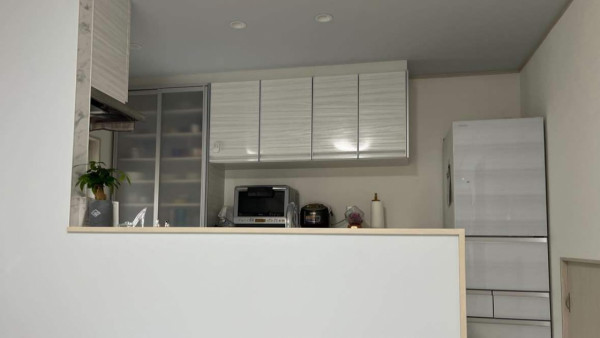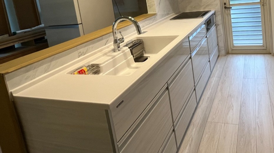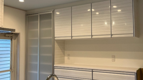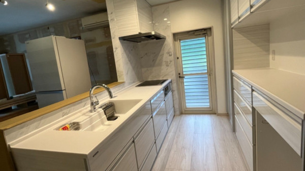 お客様ご要望の白を基調としたキッチンに仕上がりました。床や建具もお客様のご要望に沿って工事を進めていき、ご希望に叶った仕上がりに満足頂けました。