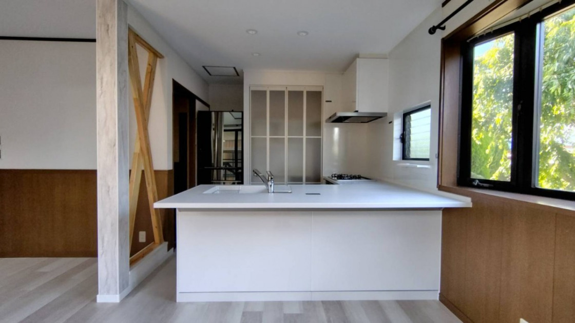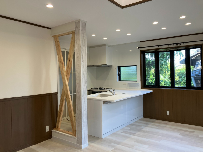 壁を撤去し、耐力壁をあらわし筋違いにすることで、圧迫感なく明るいキッチンになりました。