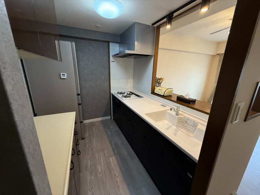 今回のリフォームでは、キッチンの扉色に落ち着いたサンドブラックを採用し、壁紙はグレー系で統一しました。