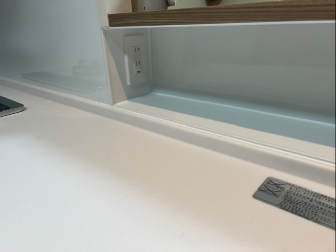 家具側収納部分にはタカラのキッチンパネルを貼っています。収納内部横側にコンセントも取り付けました。