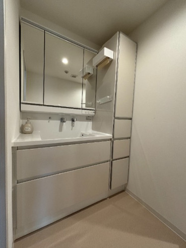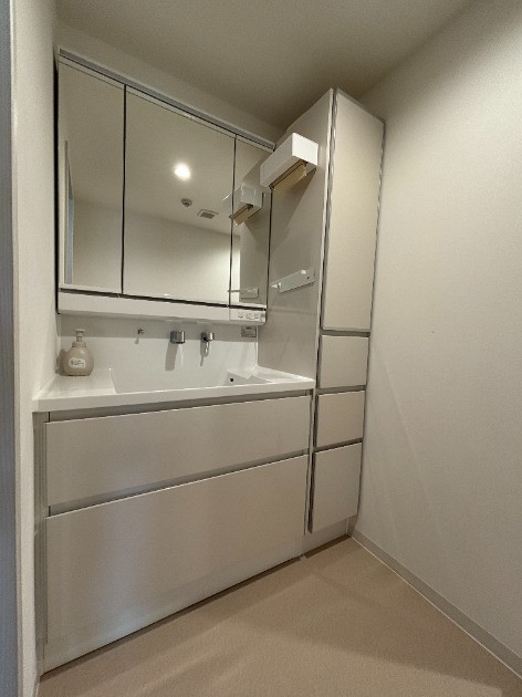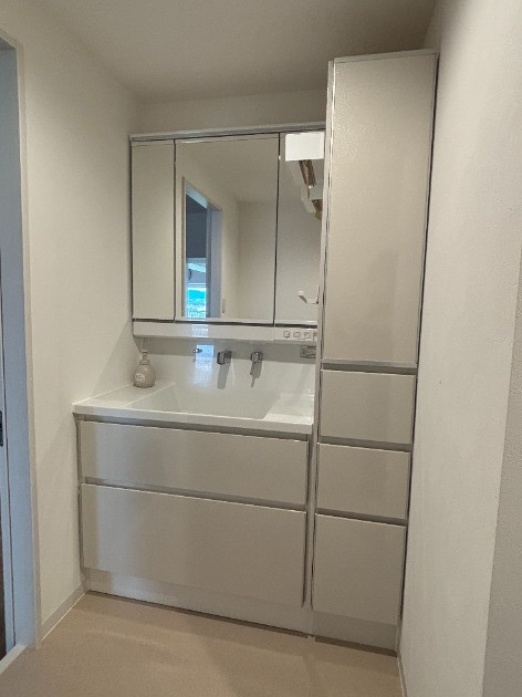 洗面所は洗面台と洗濯機でいっぱいになっていました。洗濯機を使っていると洗面台の前は通れずお一人で使う空間になっていました。浴室を1616に大きくしお風呂をL型で囲む様に設計しました。浴室の横にはドラム式洗濯乾燥機。L型のもう一つは1200サイズの洗面台。どちらを使われていても重なる事のない導線になりました。L型の真ん中には開閉式のたたみ台を設け家事導線・洗面台の快適さ・トールキャビネットの収納力・足りなかった部分を全て満たして新しく生まれ変わりました。