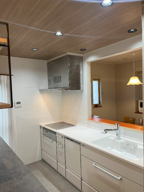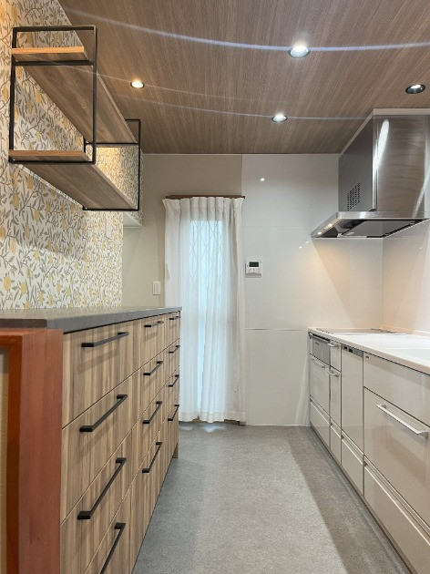 キッチンは吊り戸棚付きでしたが、吊り戸棚を設置しない事で壁を撤去し明るく開放感のあるキッチンにしました。