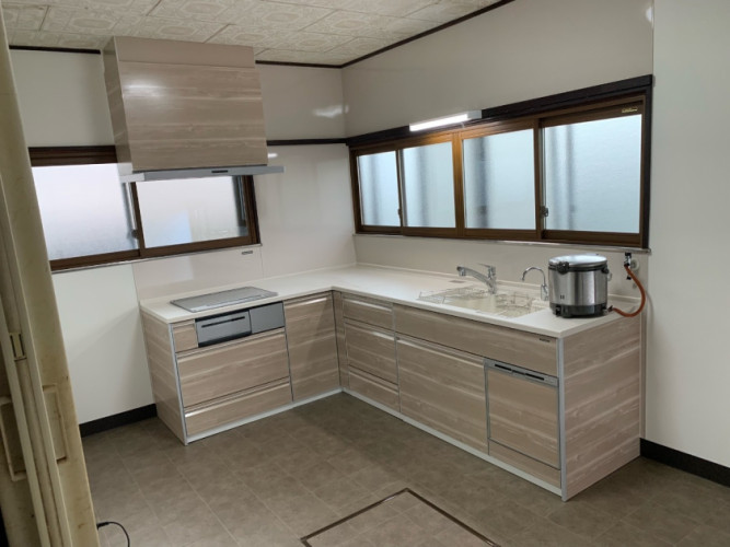 引き続きL型キッチンへ。吊戸を外し、シンクと熱機器の位置を入れ替えて作業の動線を使い易く考えました。