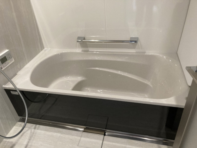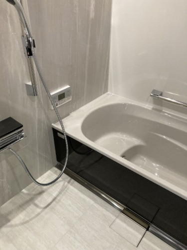 高級感のあるグランスパシリーズのリフォームです。一戸建ての浴室をスタイリッシュに刷新しました。グレーの壁とブラックの浴槽がモダンな空間を演出します。